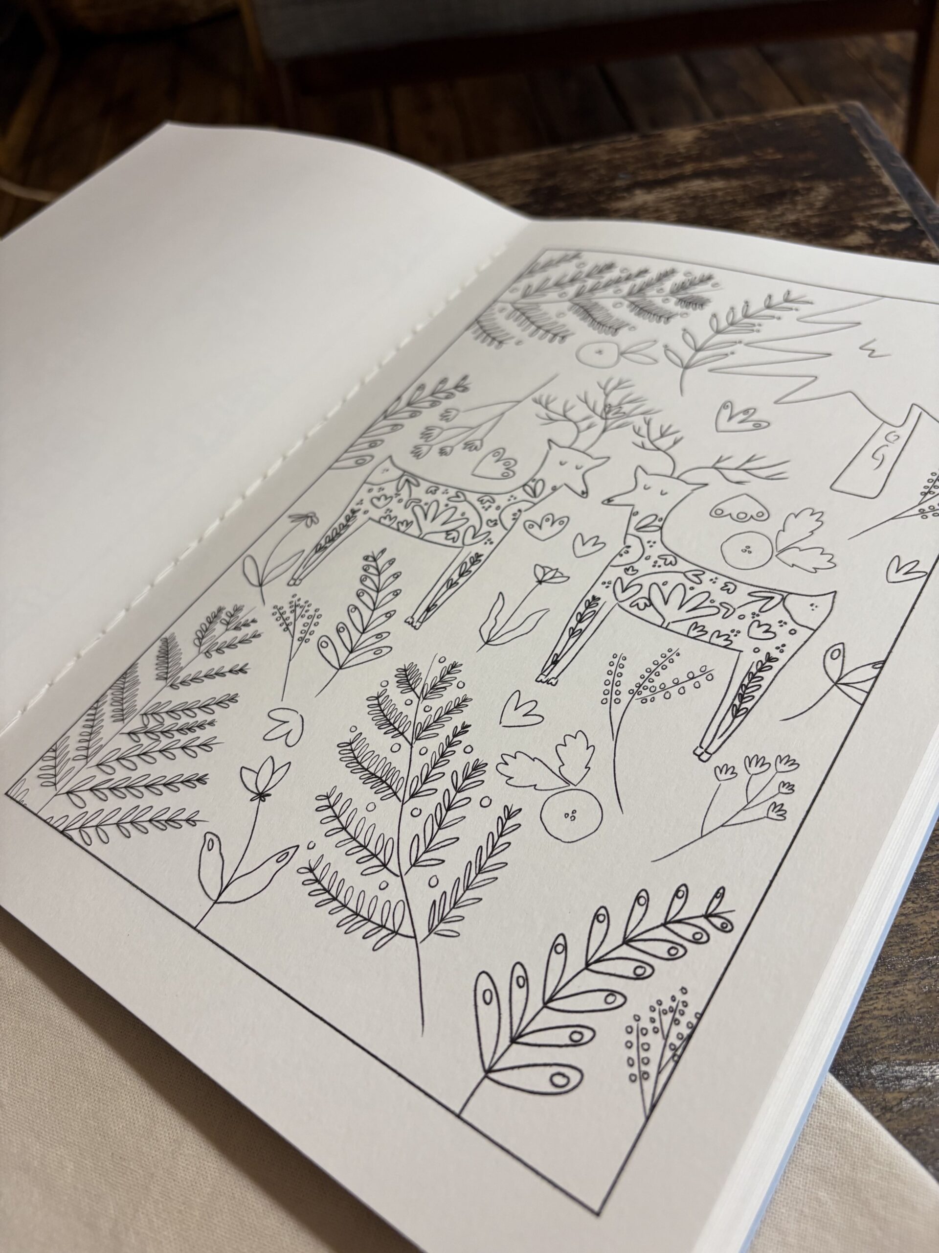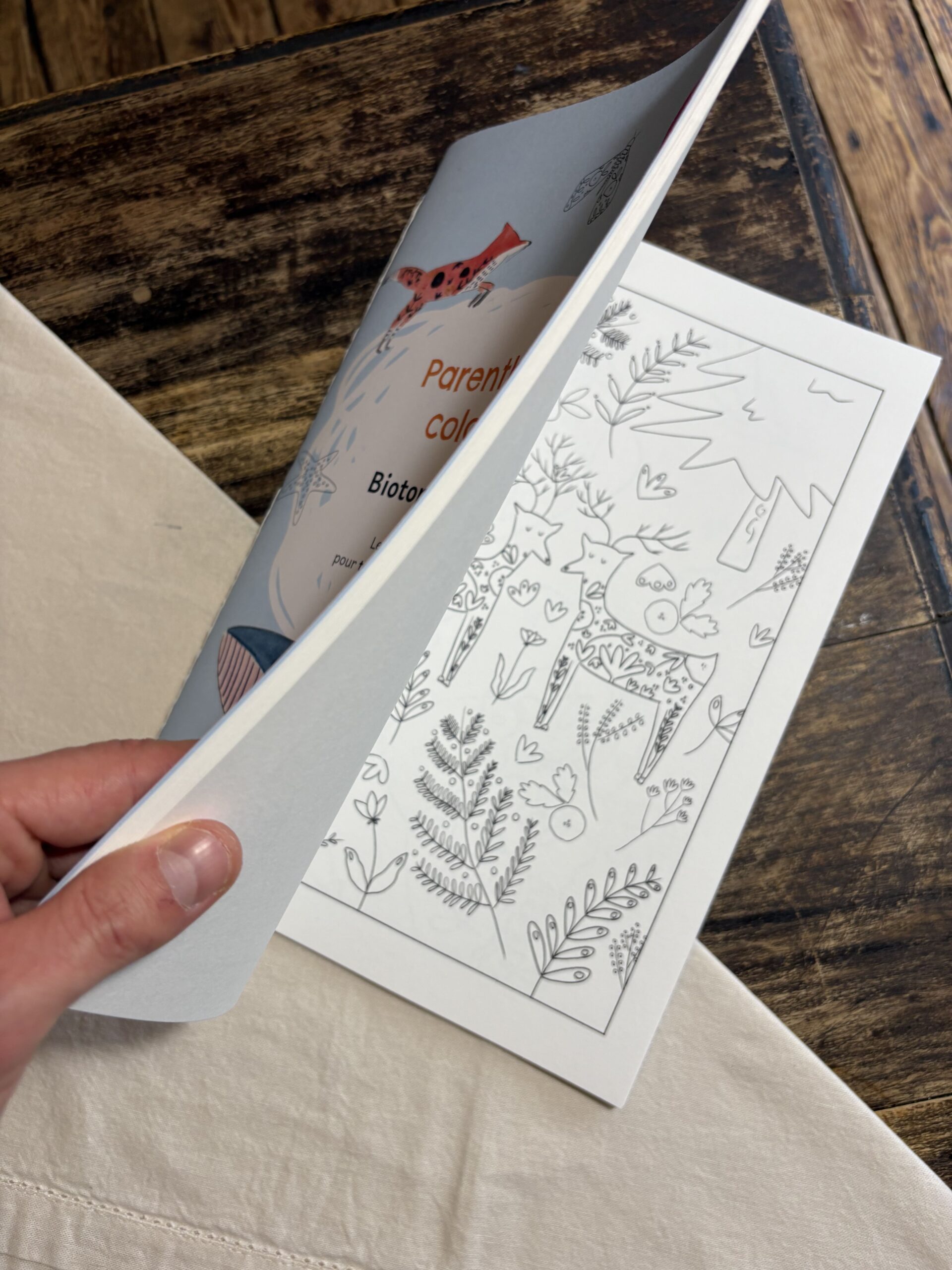 Reliure : grâce à sa reliure apparente, le cahier s’ouvre entièrement à plat — idéal pour colorier sans contrainte