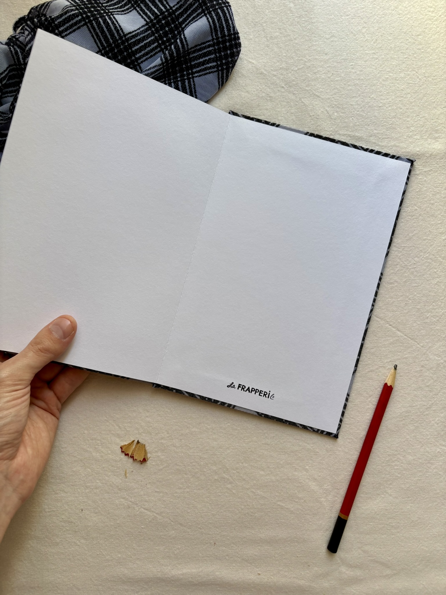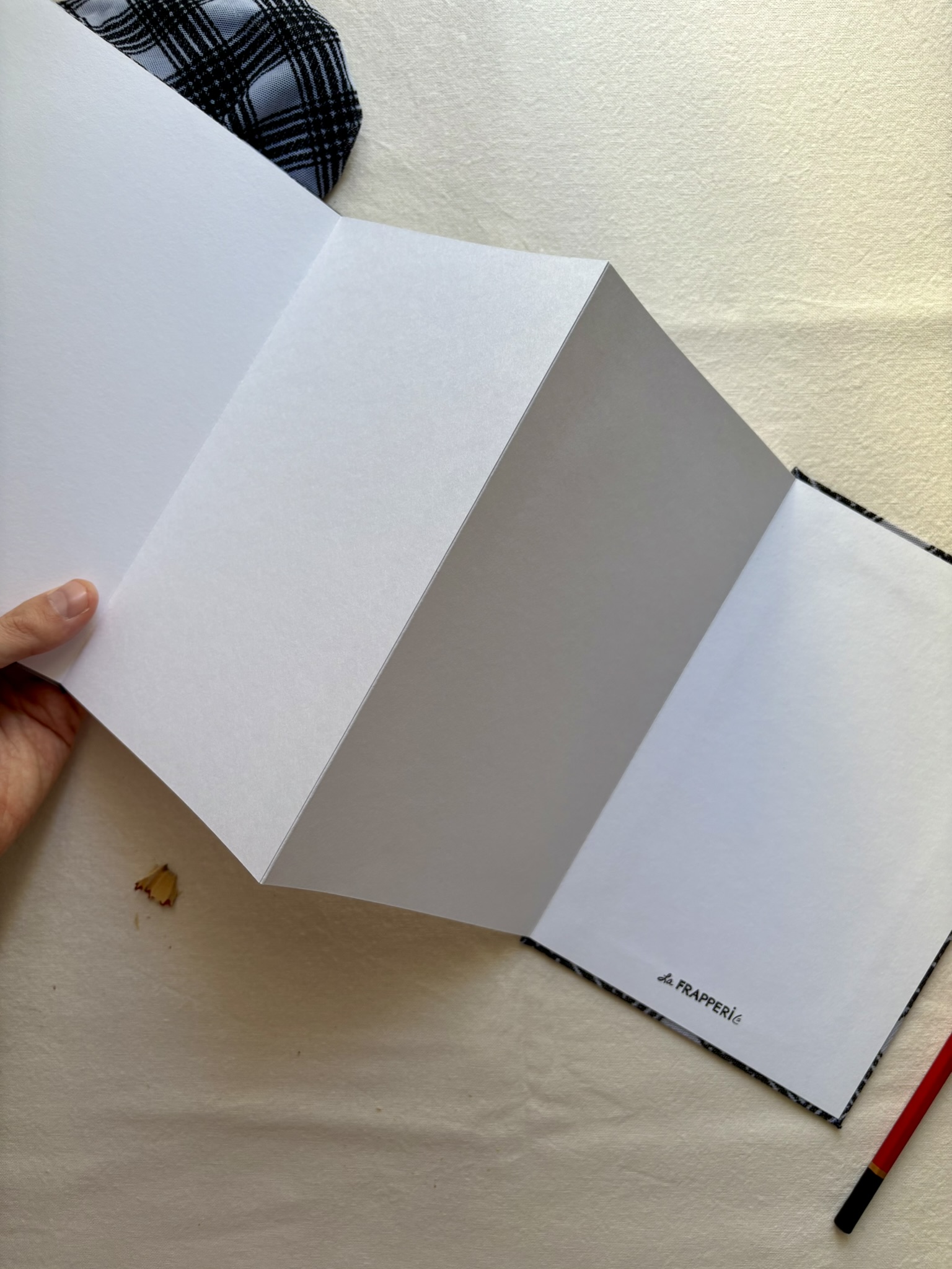 Papier intérieur : 14 pages, papier blanc multi-techniques 250 g/m² – adapté pour l’encre, les crayons, les pastels, l’aquarelle légère et le collage
